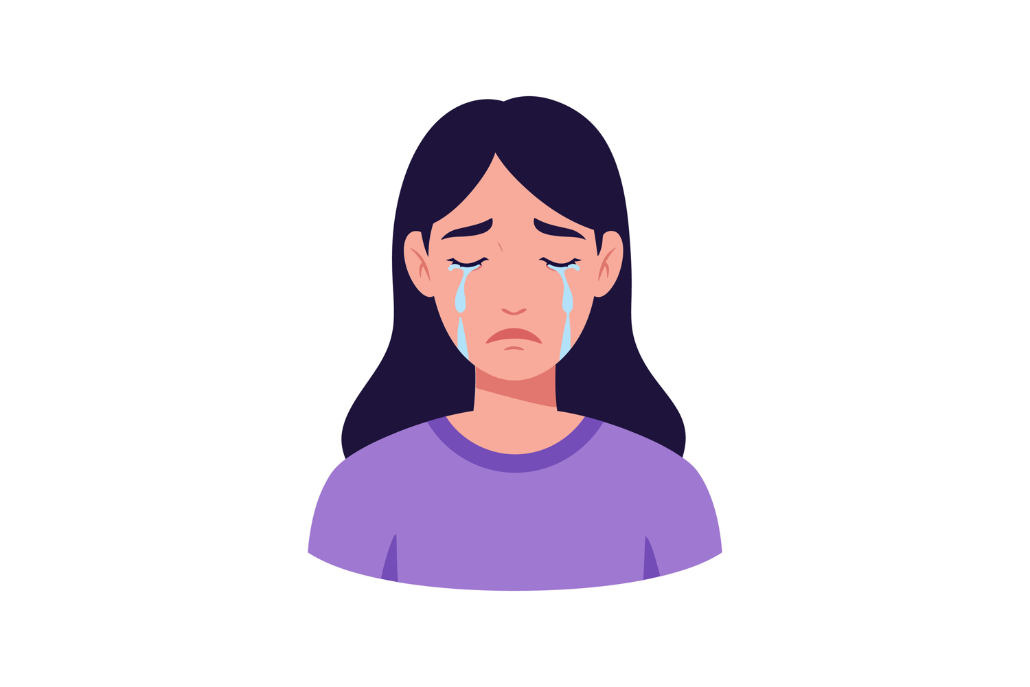 A woman with long dark hair and a purple shirt, shedding tears, conveys a sense of sadness and emotional turmoil in this vector illustration.