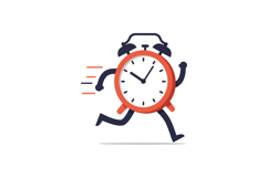 A dynamic alarm clock with arms and legs runs energetically, illustrating the theme of urgency and the importance of time management.