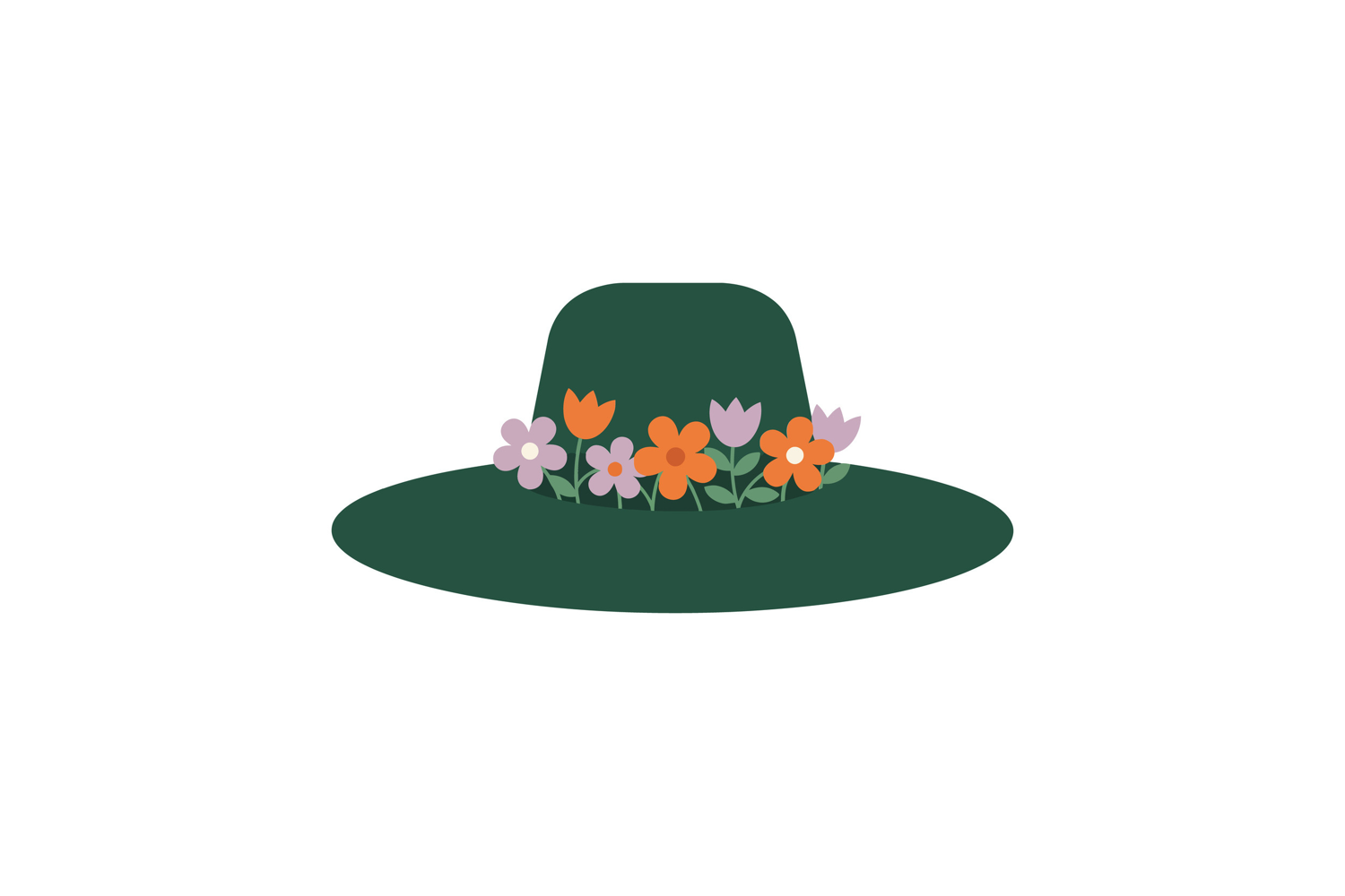 Green wide-brimmed hat adorned with colorful flowers in a fl