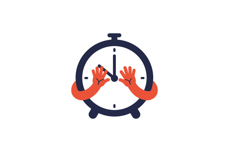 A whimsical clock features cartoonish human hands pushing the hour and minute hands, creating a playful atmosphere about time management.