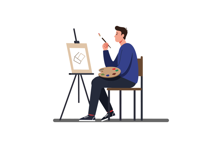 A focused artist holds a brush, contemplating his sketch on an easel, surrounded by vibrant colors on a palette.