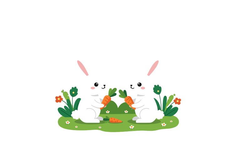 Animal Flat Cute Nature Green Flower Garden White Rabbit Carrot