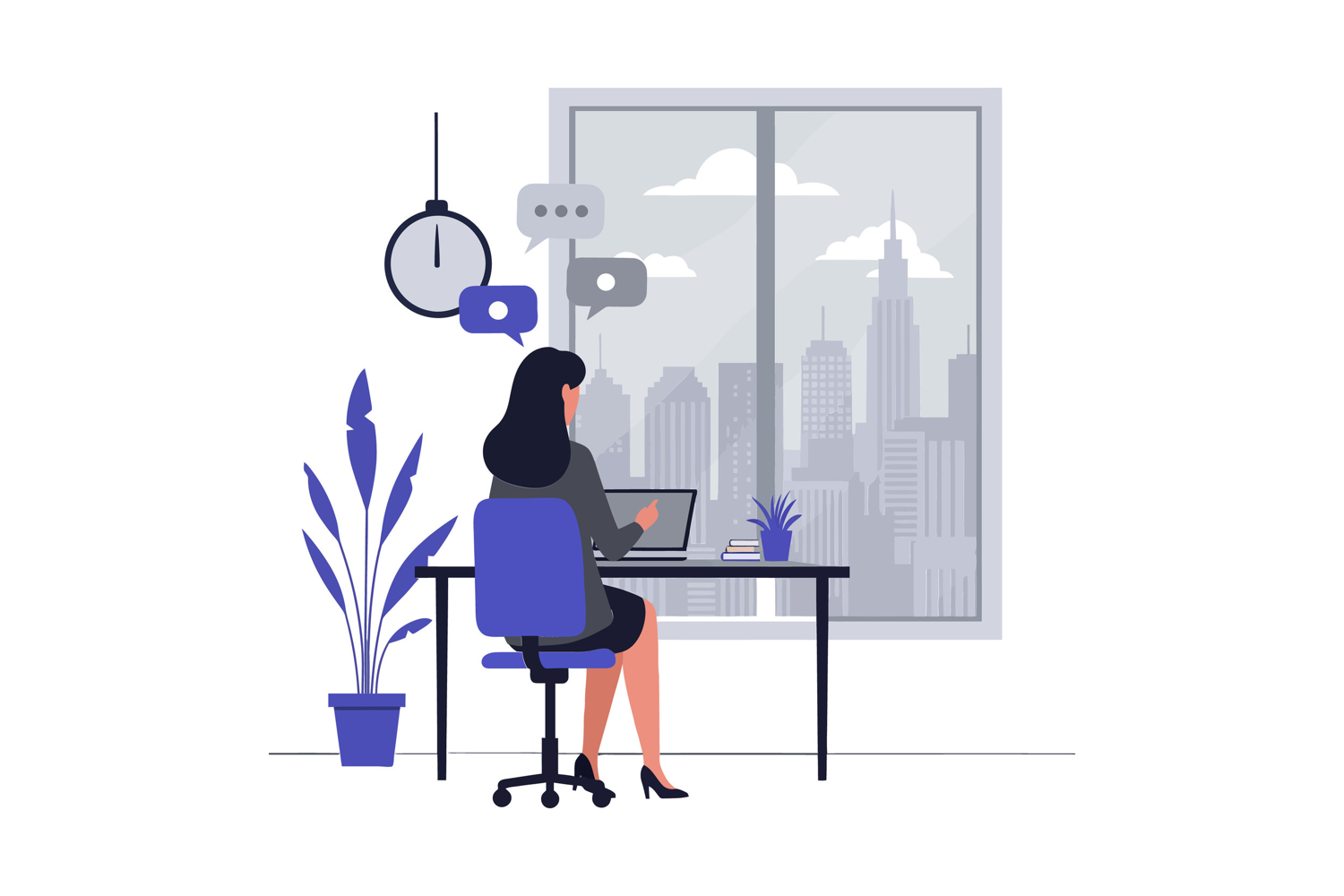 Urban Design Office Woman Minimal City Desk Skyline Laptop Plants