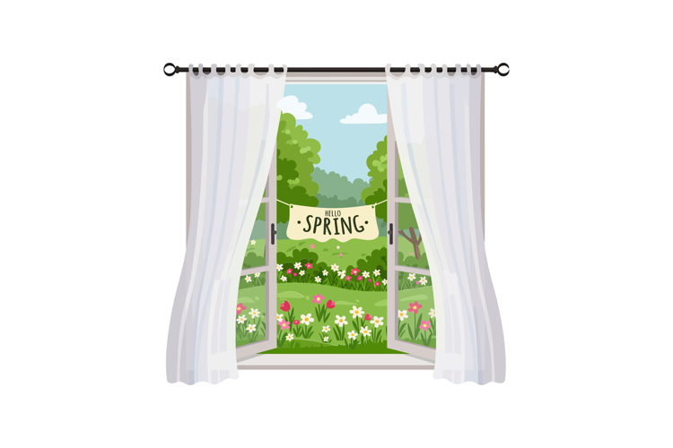 A vibrant view from a window reveals a garden filled with colorful flowers and greenery, capturing the essence of spring in an uplifting atmosphere.