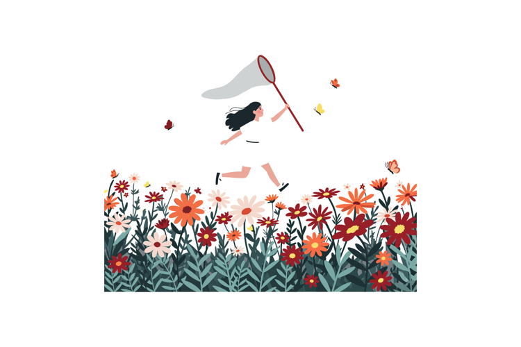Girl running through vibrant flowers with a net in flat vect example image 1