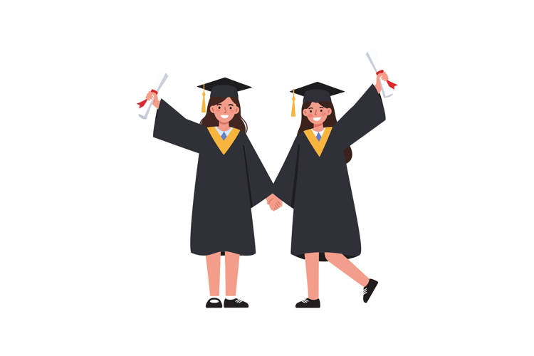 Two happy graduates celebrating their achievement in flat ve