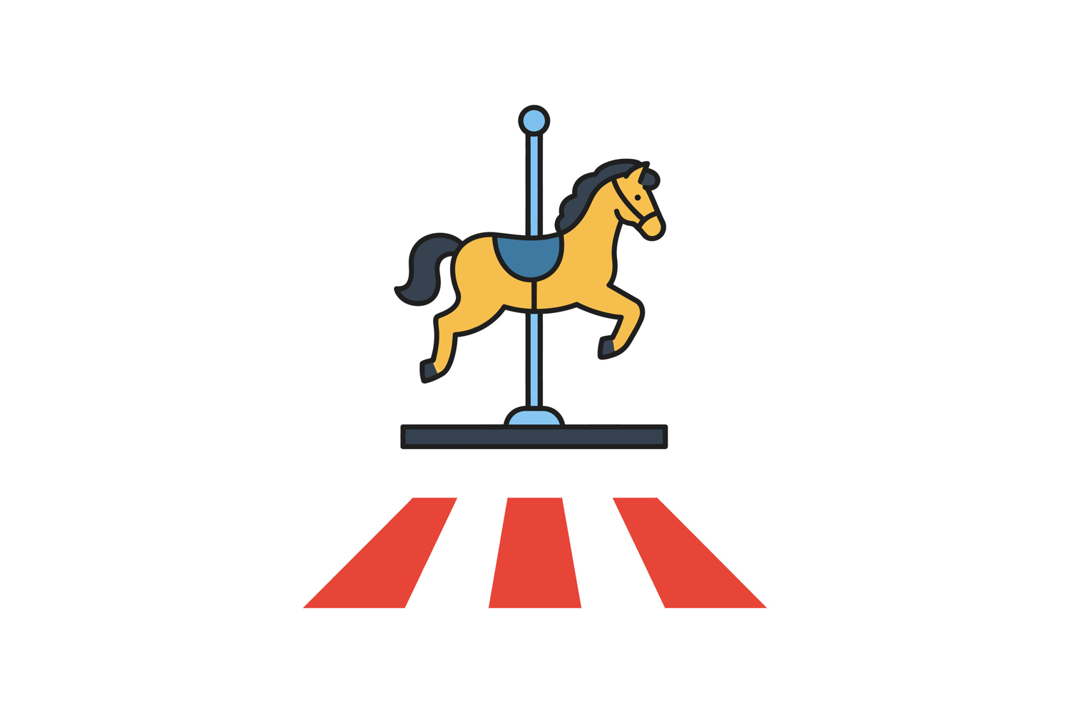 A yellow carousel horse with black mane and tail mounted on a blue pole above a red striped platform, featuring a clean flat design style.
