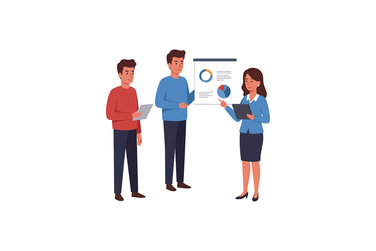 Three business people stand engaged in a presentation, analyzing colorful charts and graphs, showing collaboration and professional focus.