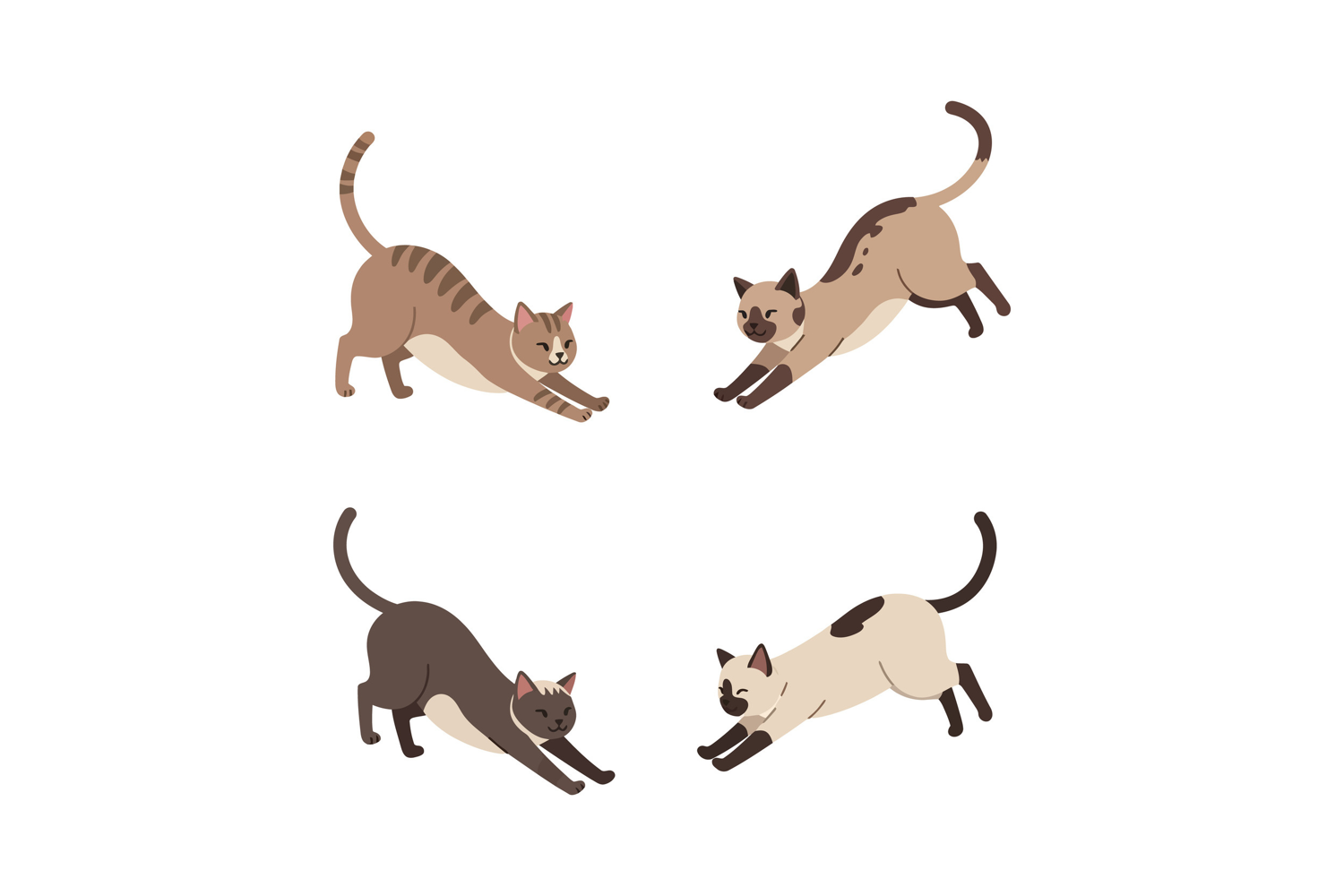 Four cats with different fur colors stretch playfully on a white background, displaying relaxed and lively postures in flat vector style.