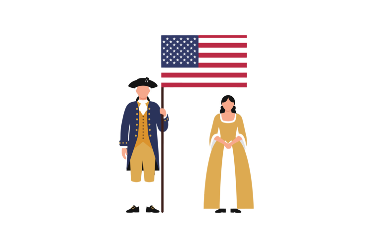 A man in a colonial outfit holds the American flag while a woman in a yellow dress stands beside him, evoking a sense of patriotism.