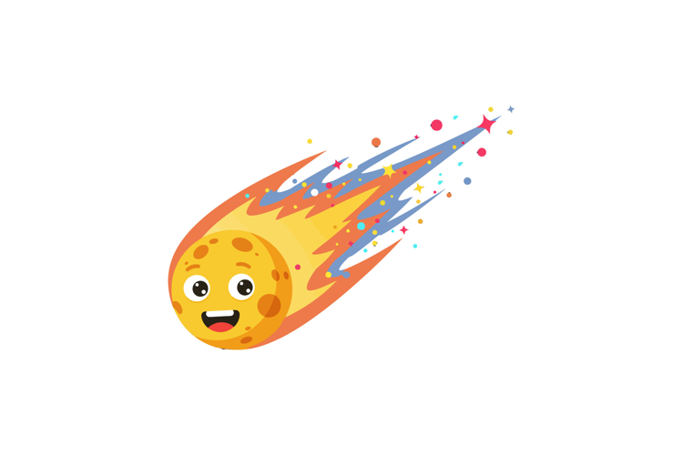 A playful comet with a happy expression zooms through space, leaving vibrant trails of stars and colors behind.
