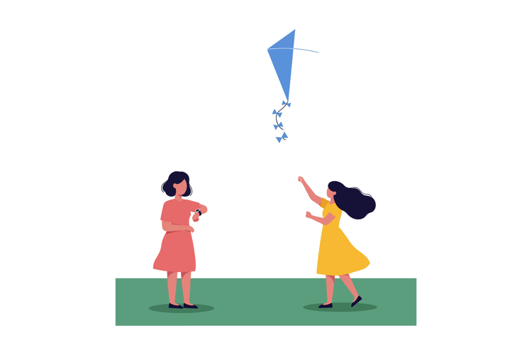 Two girls in vibrant dresses play joyfully as they fly a blue kite on a sunny day, embodying happiness and friendship.