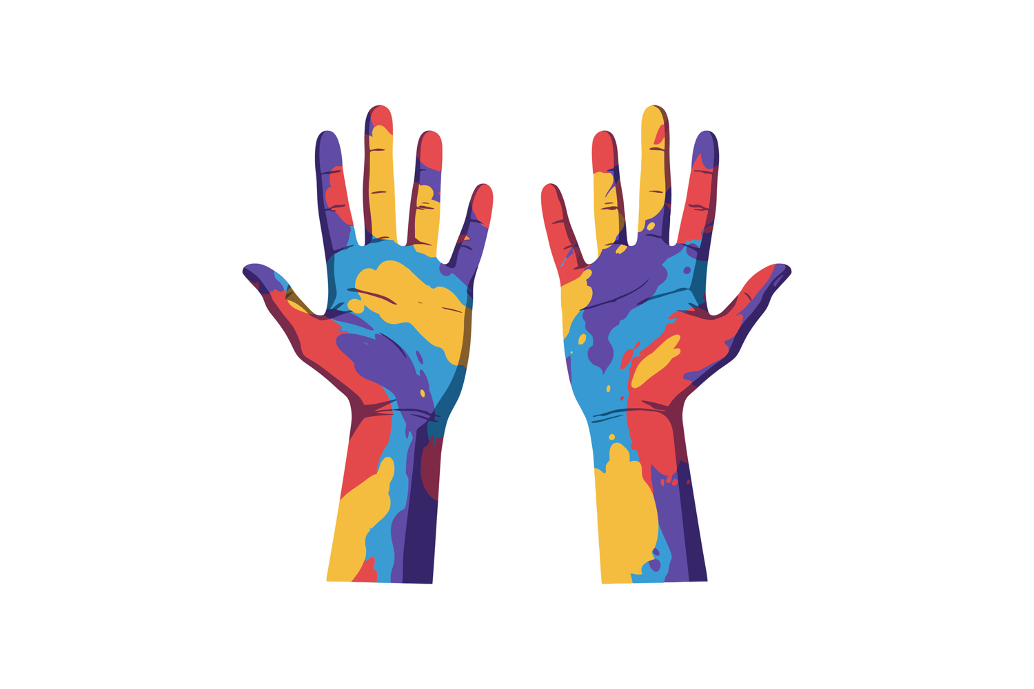 Colorful human hands with vibrant paint patterns in a flat d