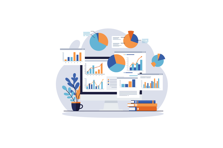 A computer monitor showcases various graphs and charts with vibrant colors, surrounded by books and a potted plant, evoking a productive atmosphere.