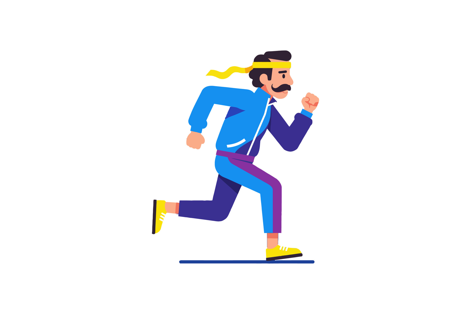 A man runs swiftly in a blue and purple tracksuit, showcasing determination and energy, with a bright yellow headband adding vibrancy.