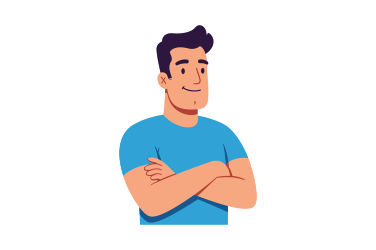 Illustration shows a confident young man with crossed arms wearing a blue shirt, standing against a white background in a relaxed pose. Calm mood.