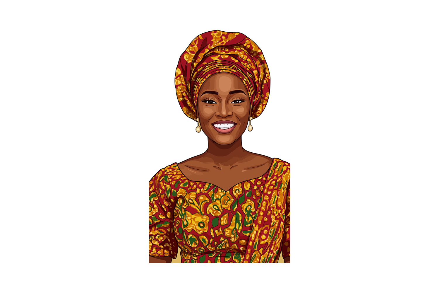 Illustration of an African woman smiling warmly, dressed in vibrant traditional attire with a patterned headwrap, portrait orientation, joyful mood.
