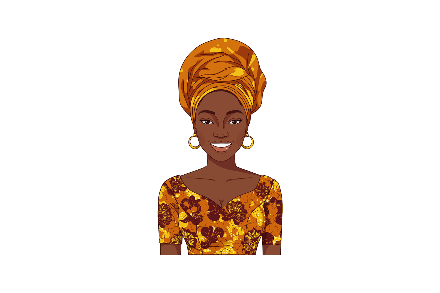 Illustration shows an African woman smiling and wearing an orange headwrap with a floral dress in warm tones, emitting a joyful mood.