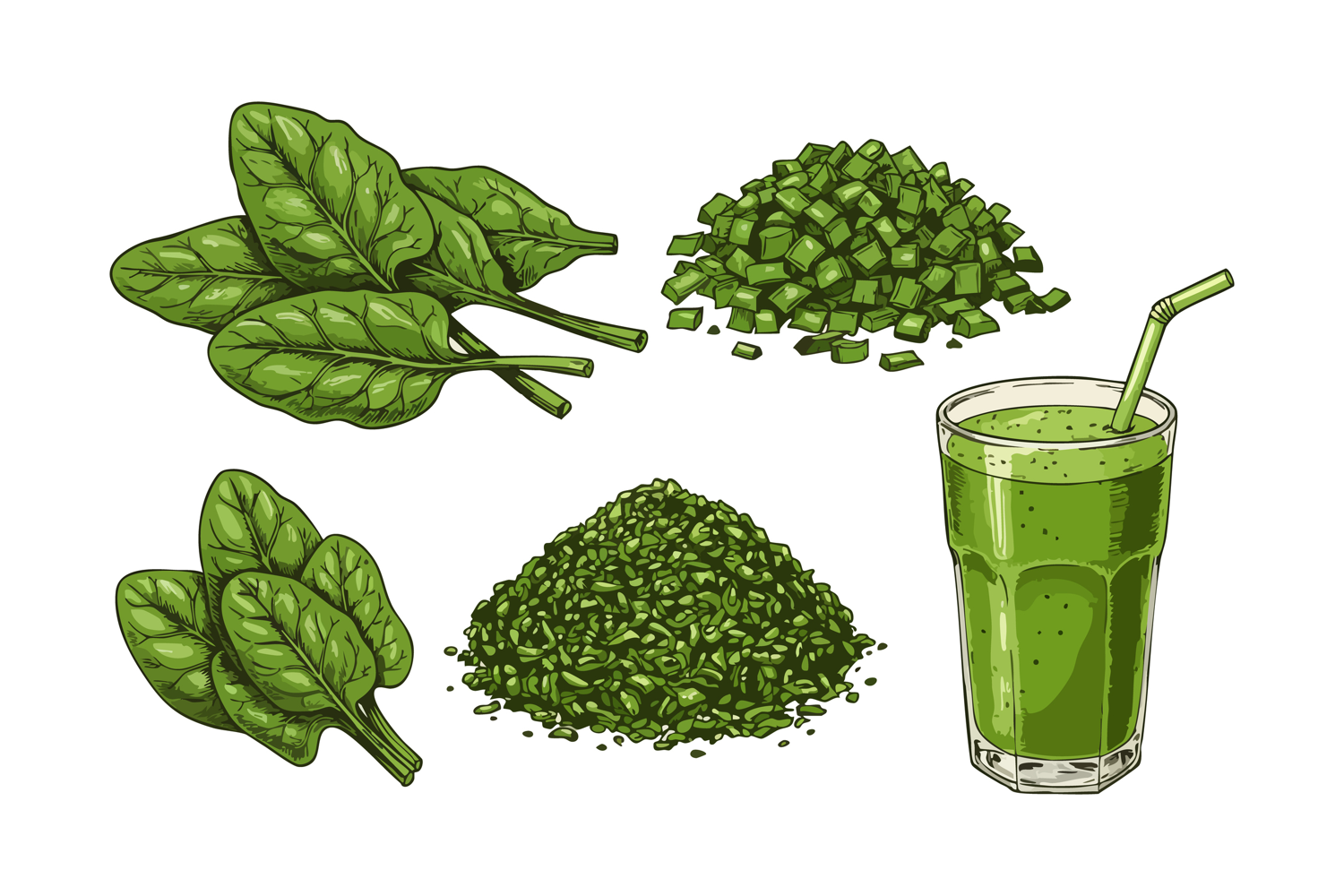 Vector illustration shows fresh spinach leaves, chopped spinach, spinach powder, and a green spinach smoothie in a glass with a straw, healthy and fresh mood.