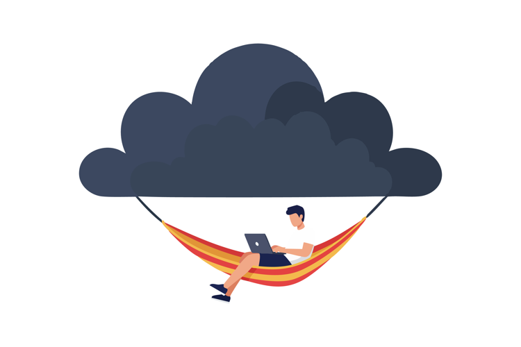 Illustration shows a man using a laptop while resting in an orange striped hammock hanging from a dark cloud, expressing a focused mood.
