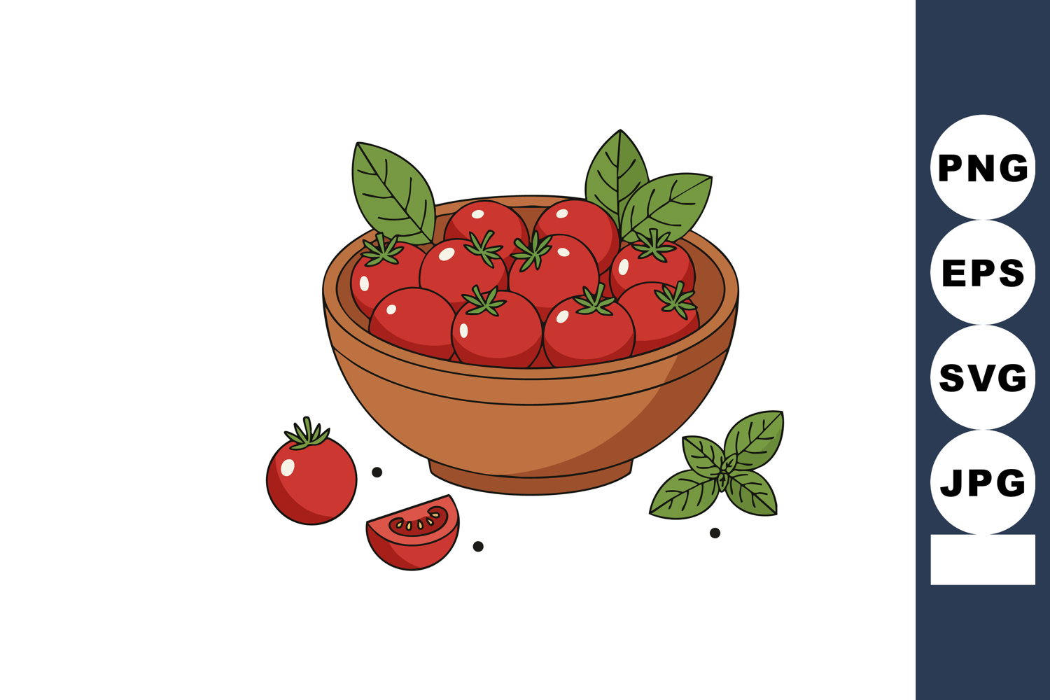Illustration shows a bowl filled with red tomatoes and green basil leaves in a simple style with bright colors. The mood is fresh.