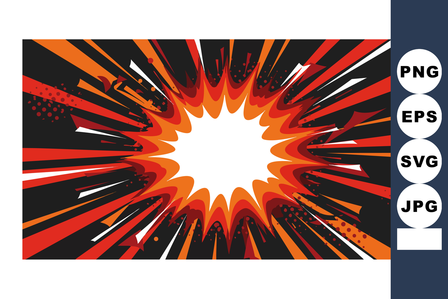 Vector image shows an explosive burst in comic style with dynamic orange, red, and black rays radiating outward, energetic and bold mood.