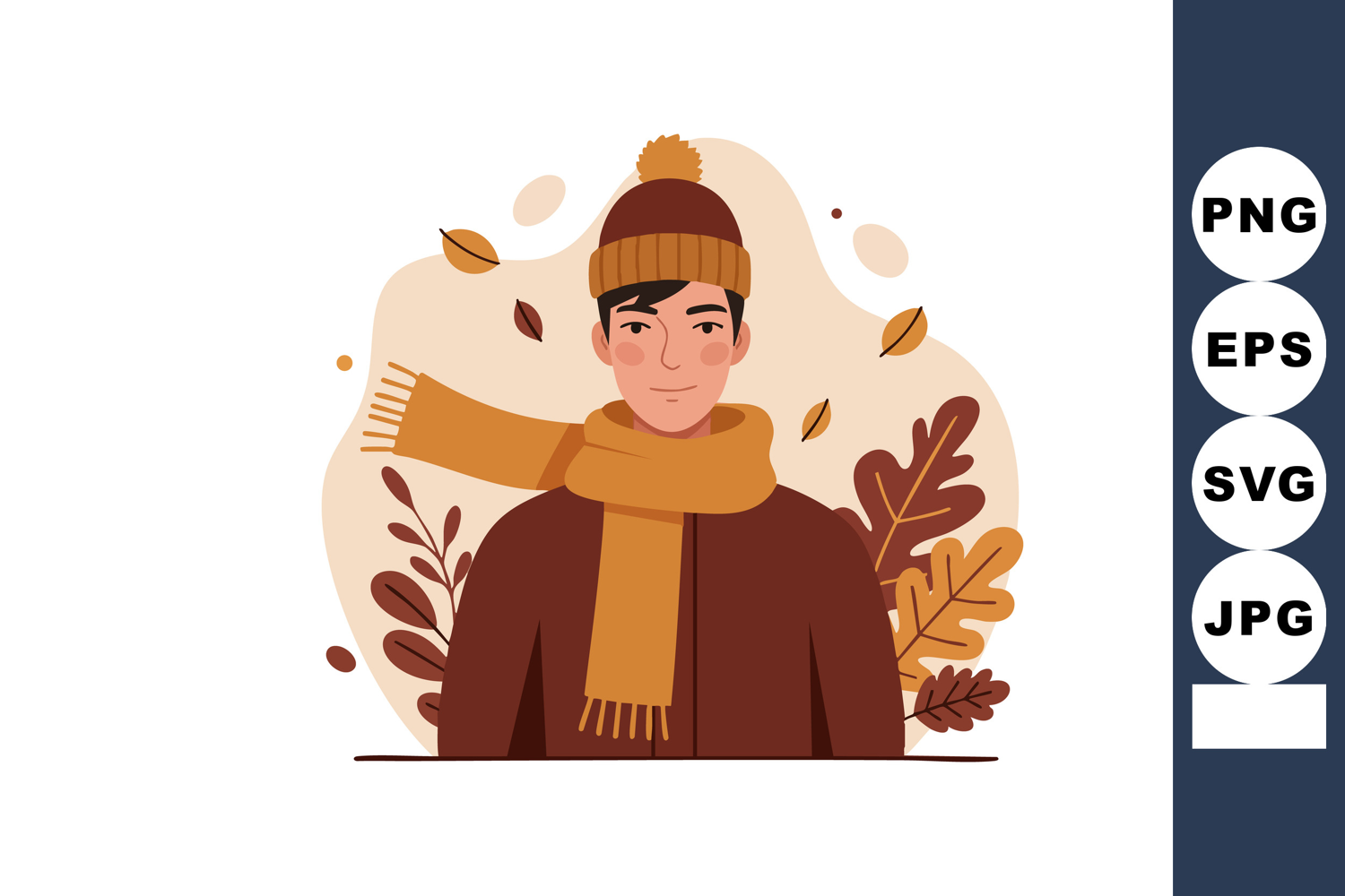 Illustration shows a young man in a brown hat and scarf surrounded by falling autumn leaves, creating a cozy seasonal mood.