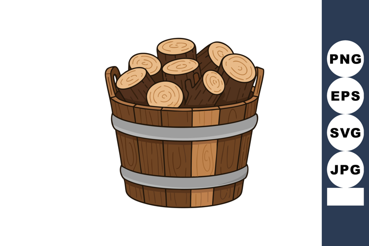 Illustration shows a wooden bucket filled with cut firewood logs, featuring rustic wood texture and metal bands, conveying a cozy natural mood.