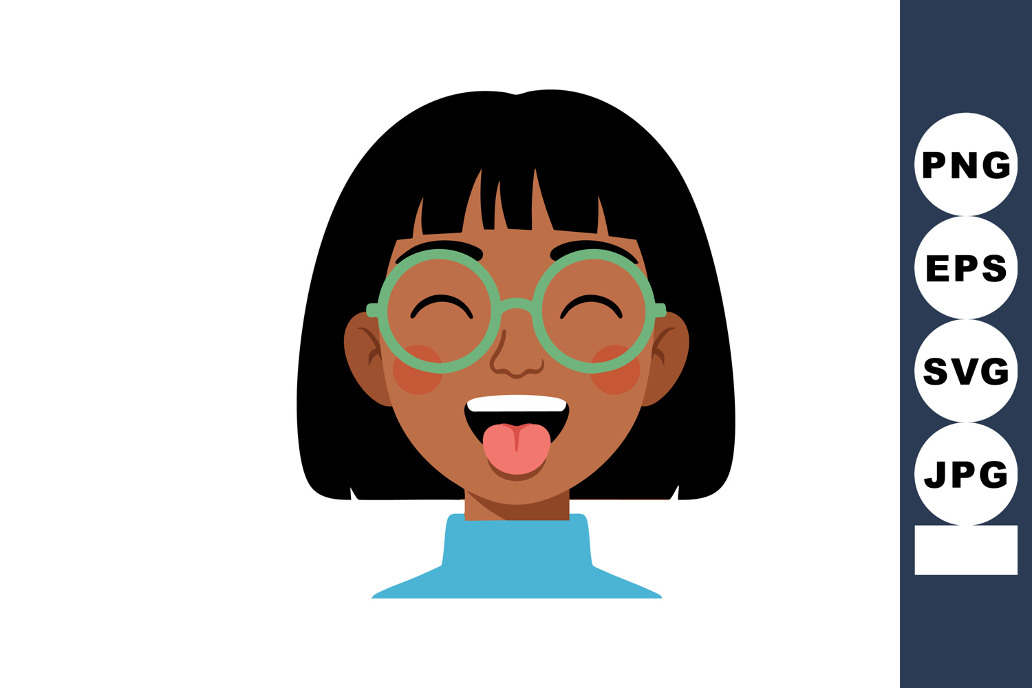Illustration of a happy girl with black hair and green glasses smiling with tongue out in a playful mood. Bright and cheerful.
