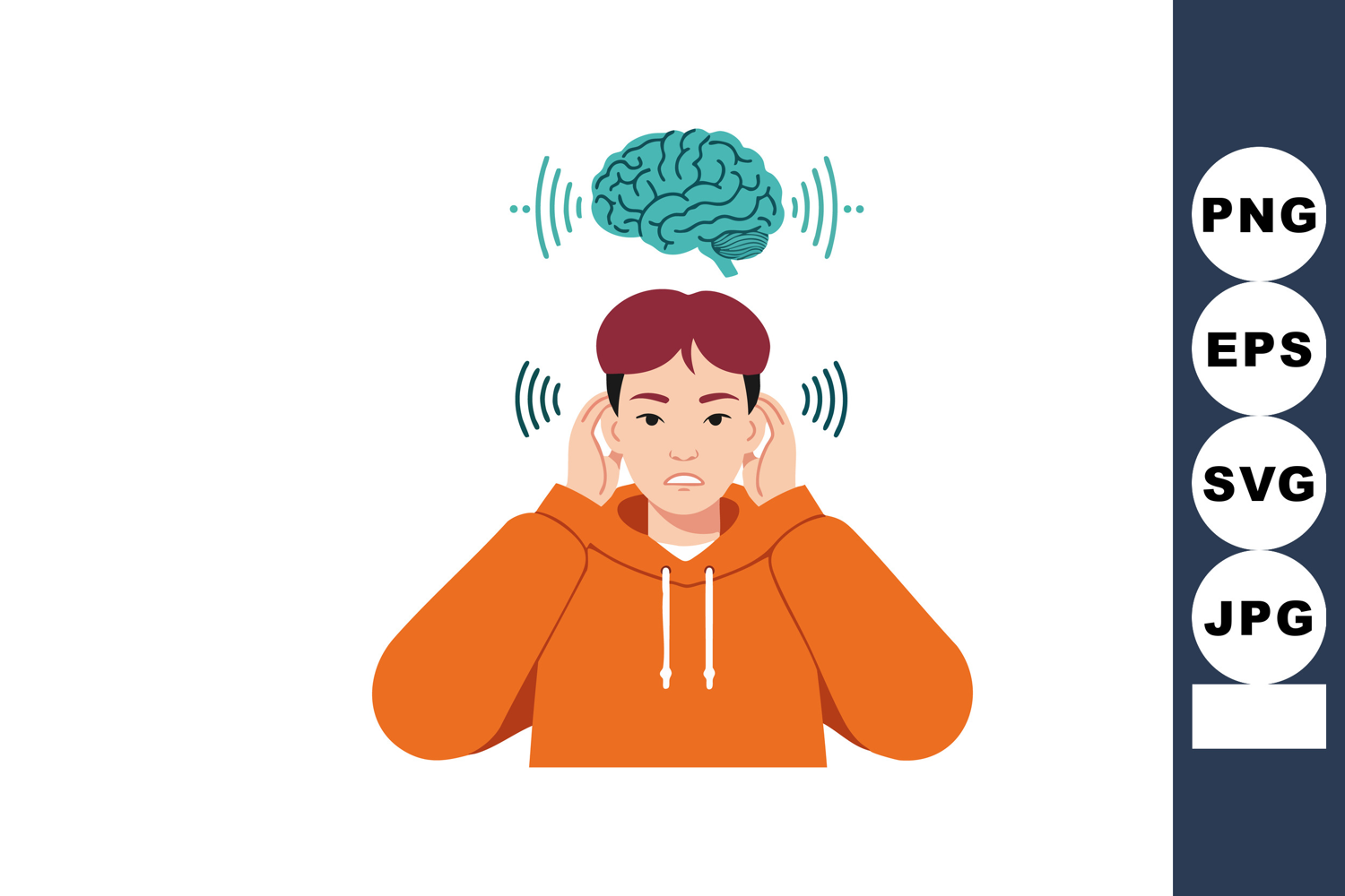 Illustration shows a young man holding his ears with a floating brain symbolizing stress or headache, depicting cognitive pressure and mental health concern. Serious mood.