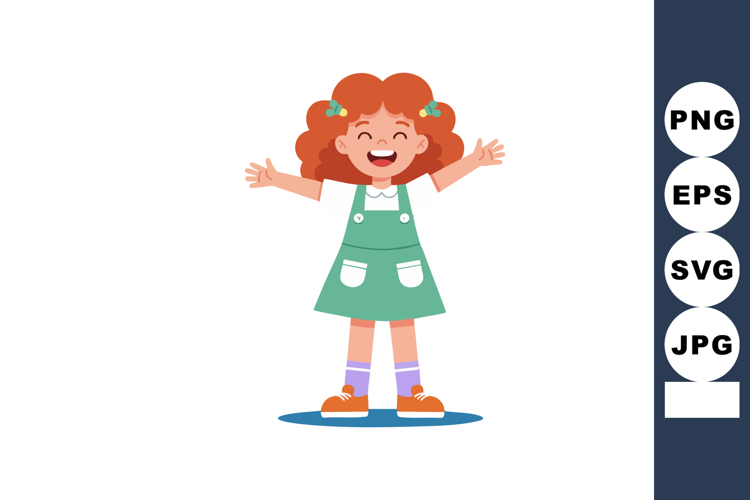 Vector of a cheerful red-haired girl wearing a green dress, smiling widely with open arms, radiating happiness and innocence. Bright and lively mood.