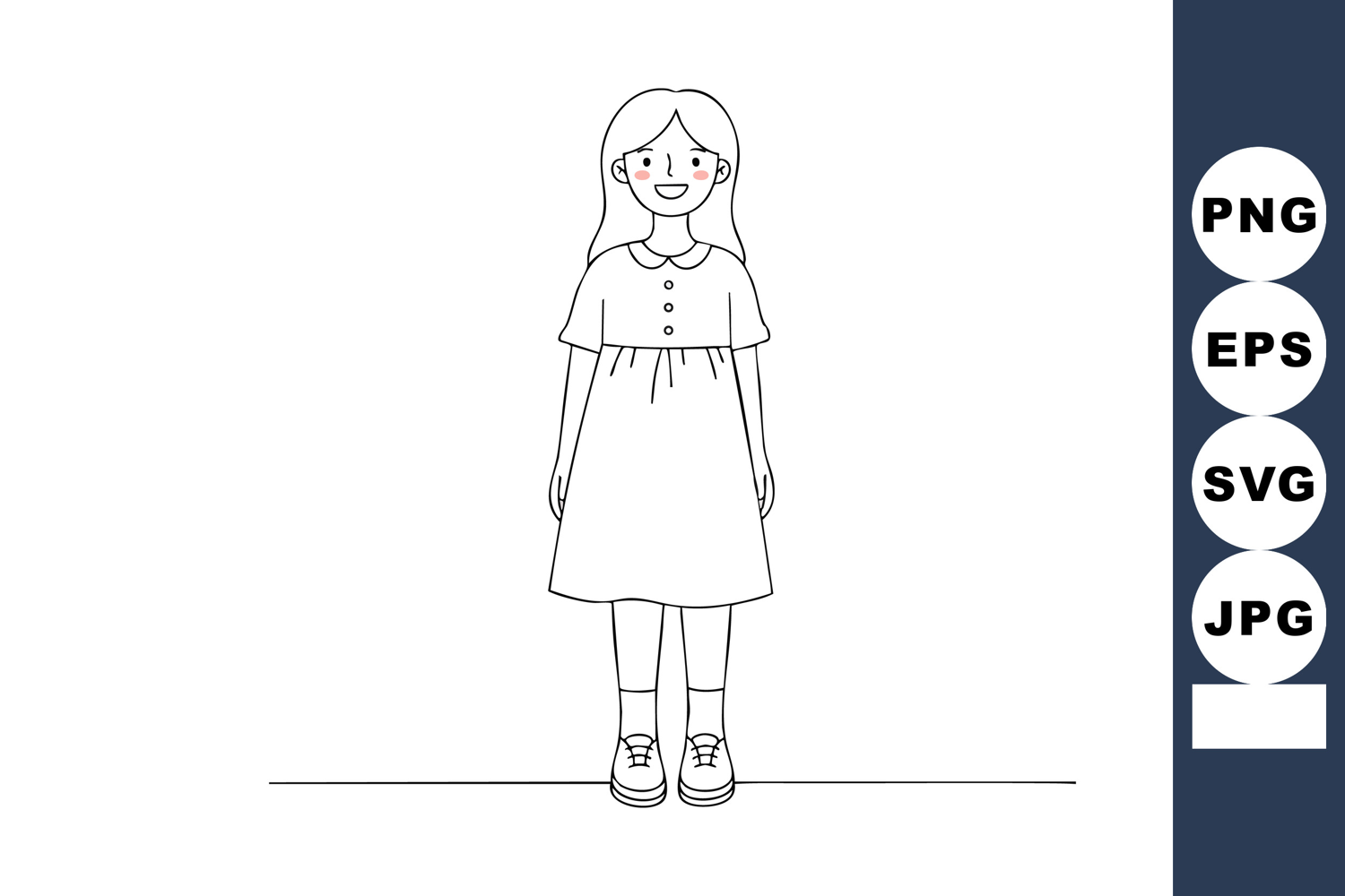 Vector illustration of a little girl standing in a dress with rosy cheeks and a smile, drawn in simple line art style, cheerful mood.