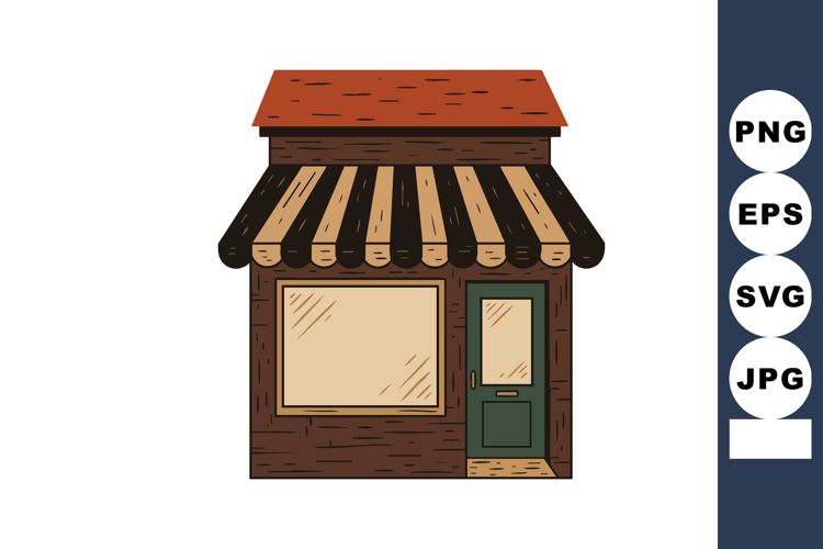 Vector image showing a small wooden storefront with a red roof and brown striped awning, designed for business or retail themes, simple and clear style.
