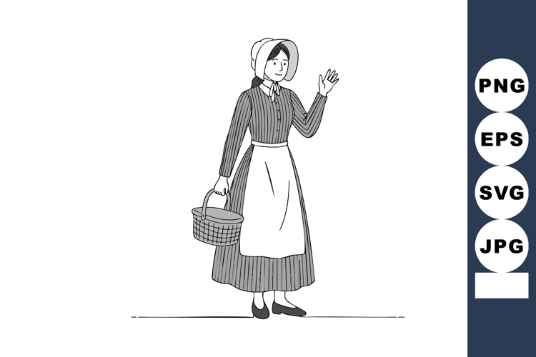 Woman wearing traditional striped dress and bonnet holds a basket and waves, depicted in black and white line art style. Calm and nostalgic.