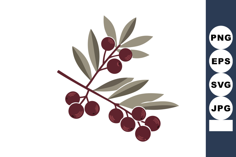 Vector illustration of an olive branch with dark red berries and muted green leaves, showing natural simplicity and elegance, calm and organic mood.