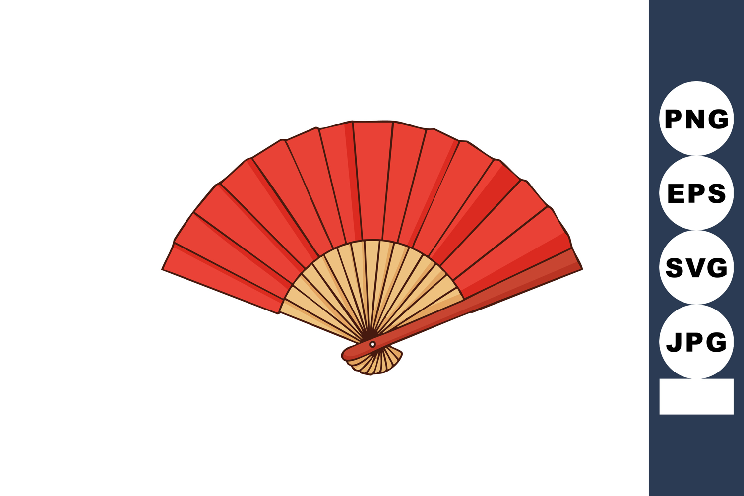Vector image shows a red folding hand fan with wooden ribs, used for cooling and decoration, simple and elegant design, calm mood.