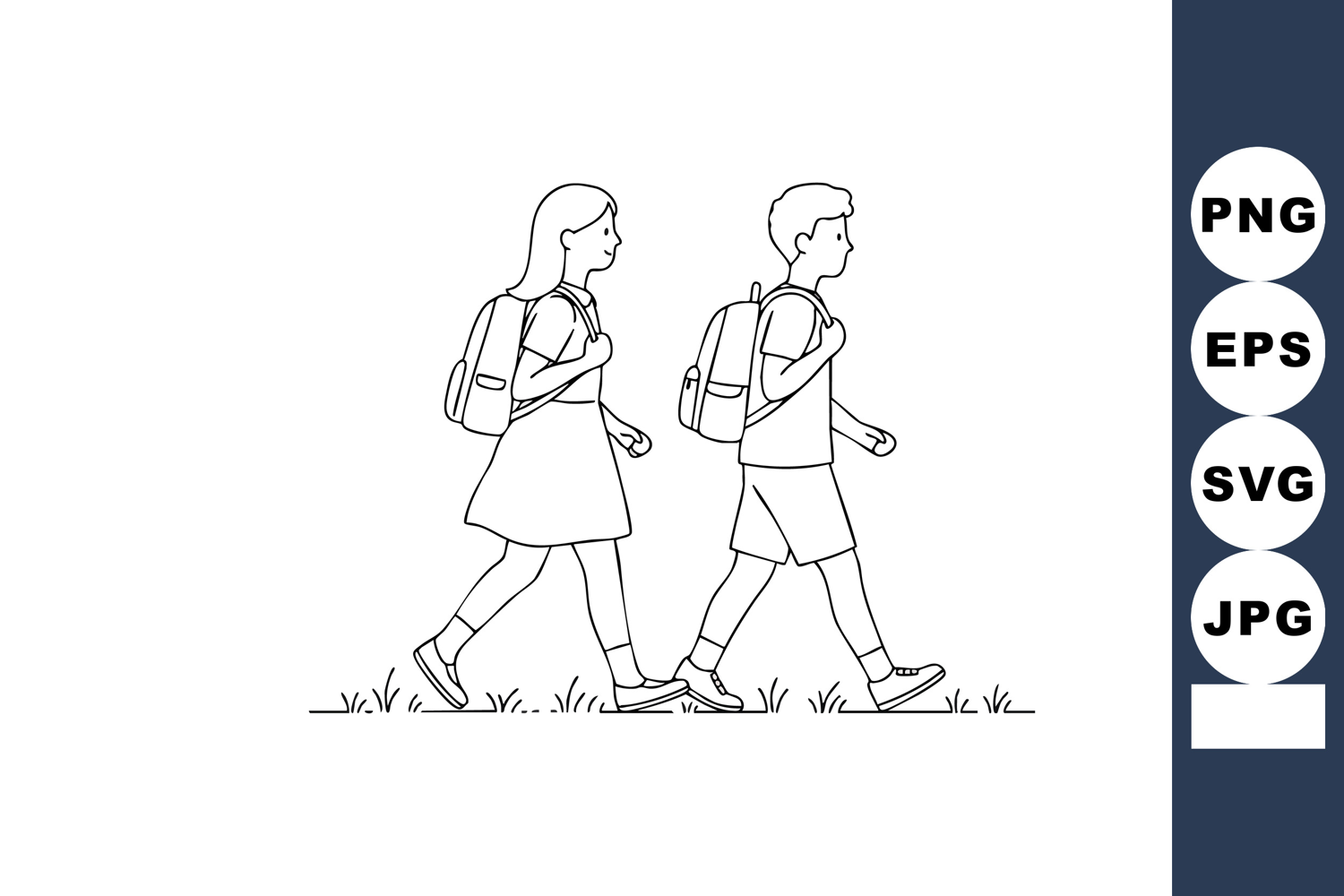 This vector shows a boy and girl walking side by side carrying backpacks on grass in simple line art style, evoking calm and focus.