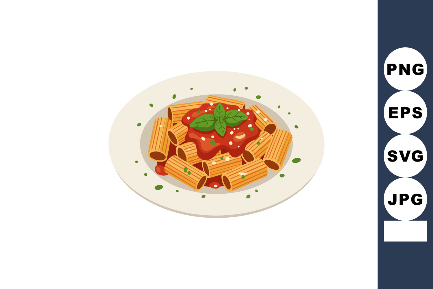 Rigatoni pasta served with rich tomato sauce and fresh basil leaves on a white plate, presented in a clean vector style, appetizing and bright.
