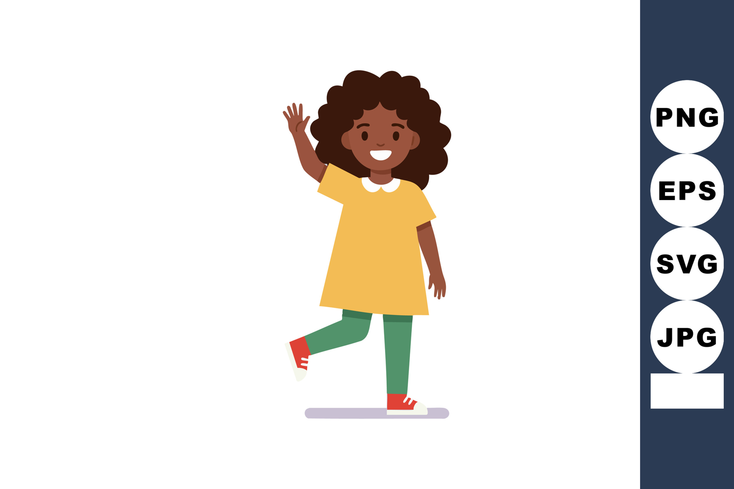 Illustration shows a cheerful young girl with curly hair waving and smiling, dressed in yellow and green clothing. Mood is joyful and friendly.
