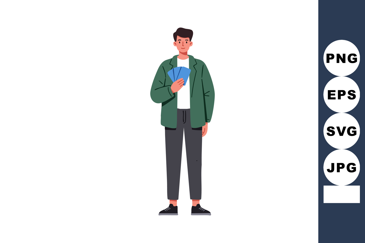The young man holds blue cards in hand wearing casual clothes, standing relaxed with neutral expression in vector style. Calm and simple mood.
