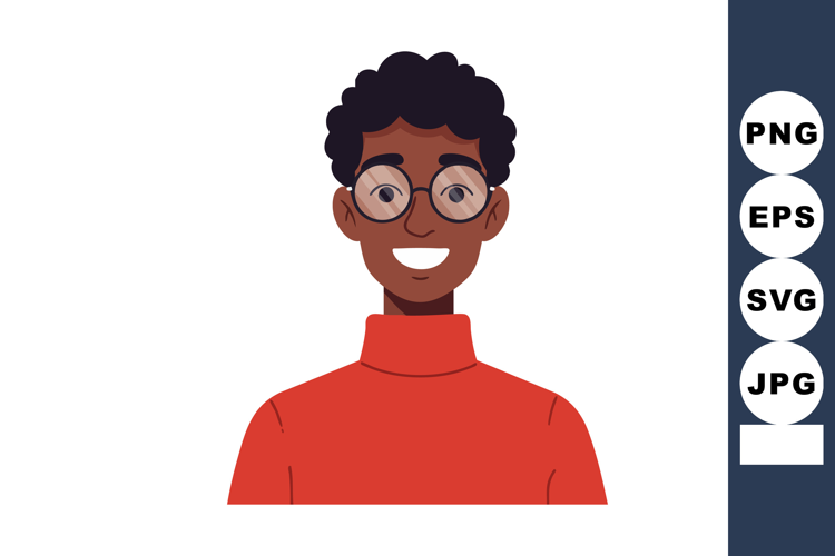 Illustration of a young man with curly hair and glasses smiling cheerfully in a red turtleneck sweater. Friendly and positive mood.