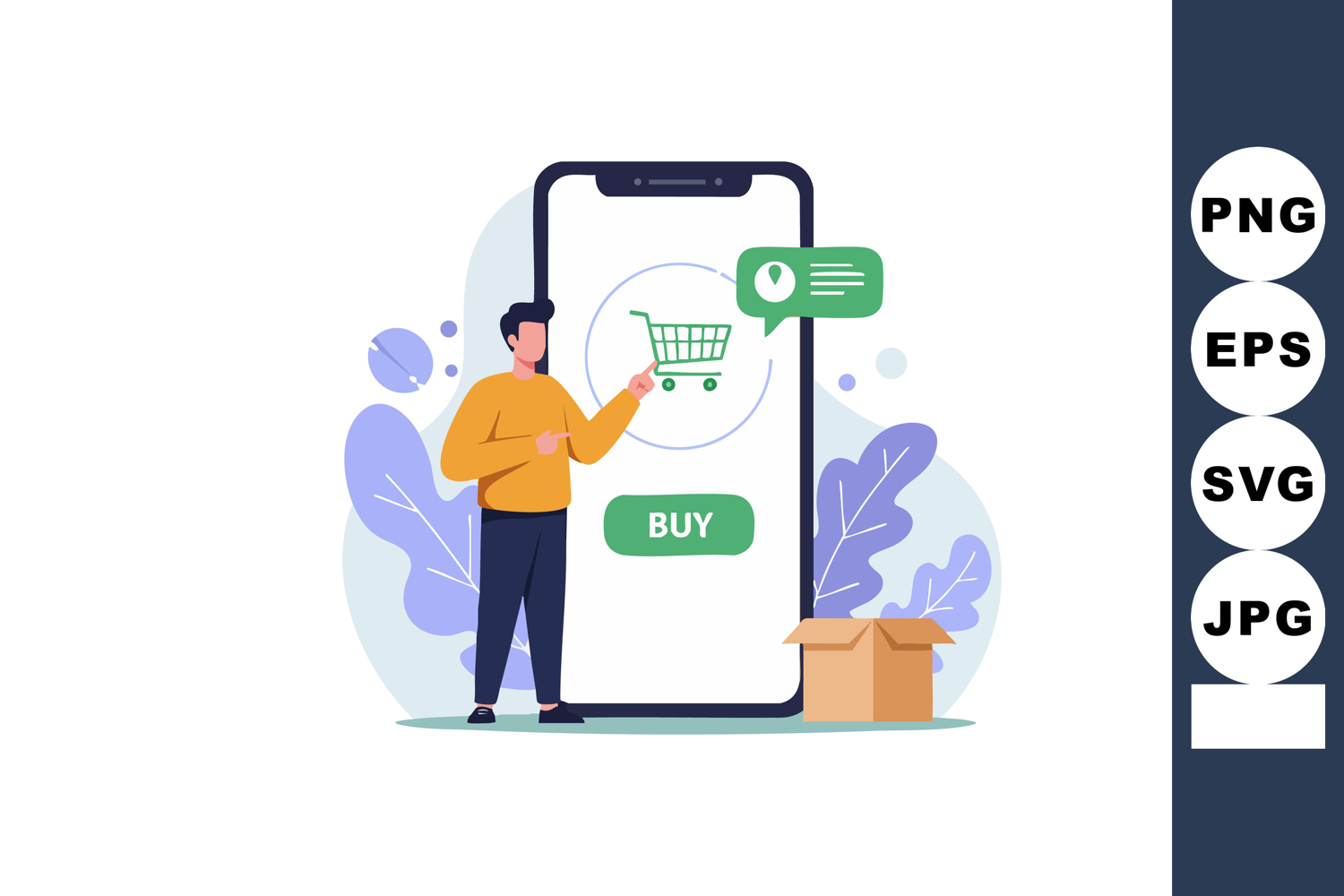 Illustration shows a man interacting with a smartphone shopping app featuring a cart icon and buy button, next to a delivery box. Calm mood.