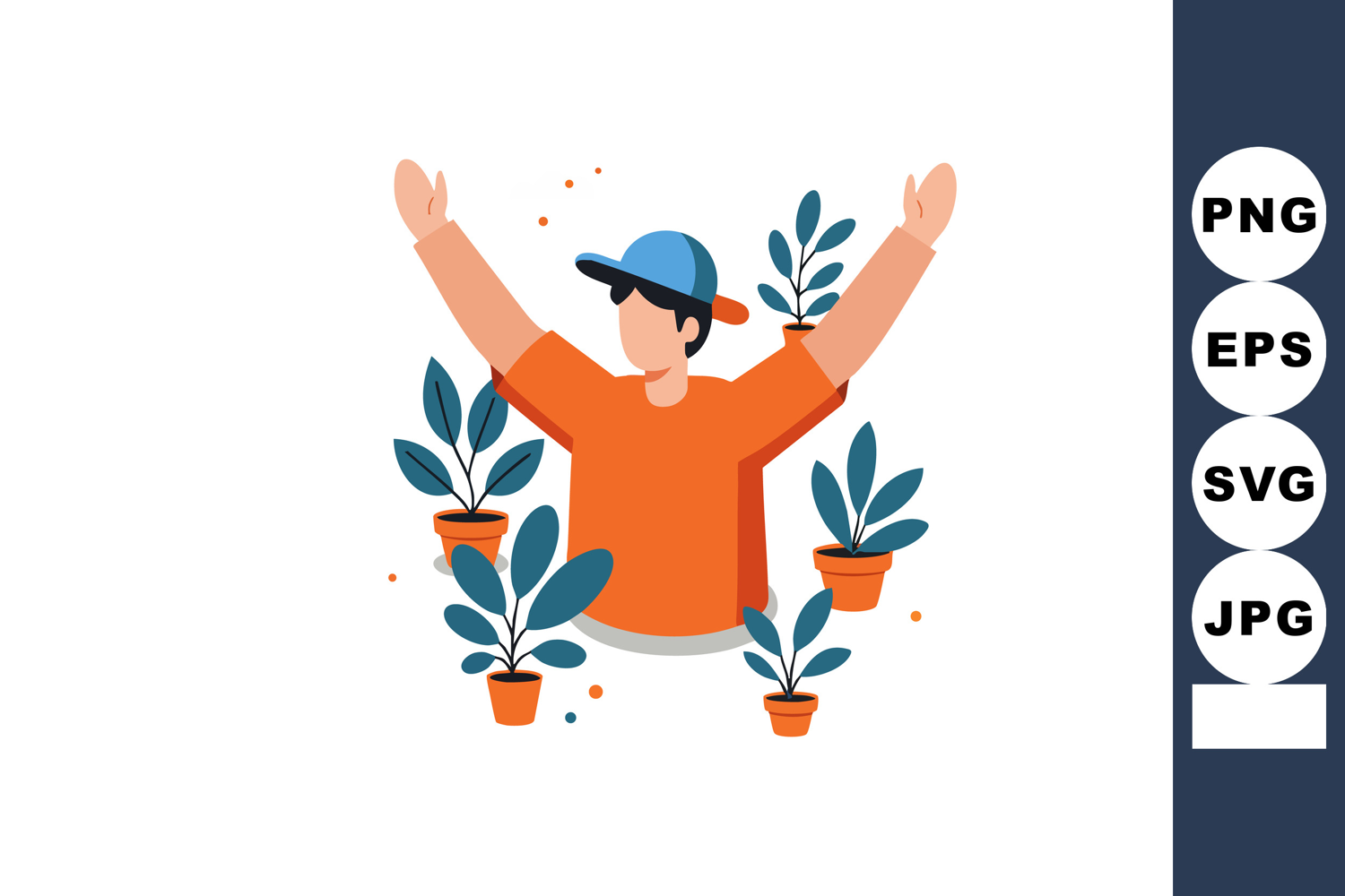 Illustration shows a young person wearing a blue cap and orange shirt surrounded by potted plants, conveying growth and positivity mood.