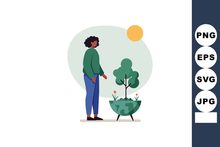 Illustration shows a woman with curly hair standing near a small tree in a pot under the sun, creating a calm and peaceful mood.