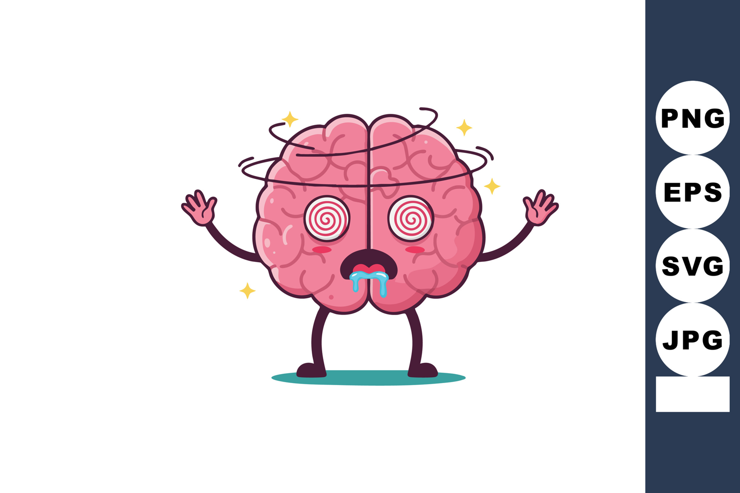 This vector shows a cartoon brain character dizzy and confused with spinning eyes and drooling mouth, creating a humorous and playful mood.