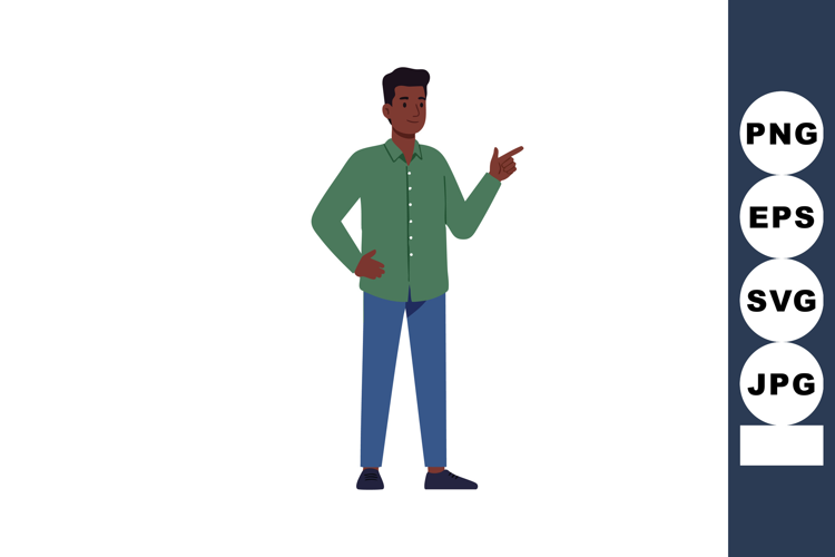 Illustration of a young man standing confidently wearing a green shirt and blue pants, pointing with his right hand. Calm and focused mood.