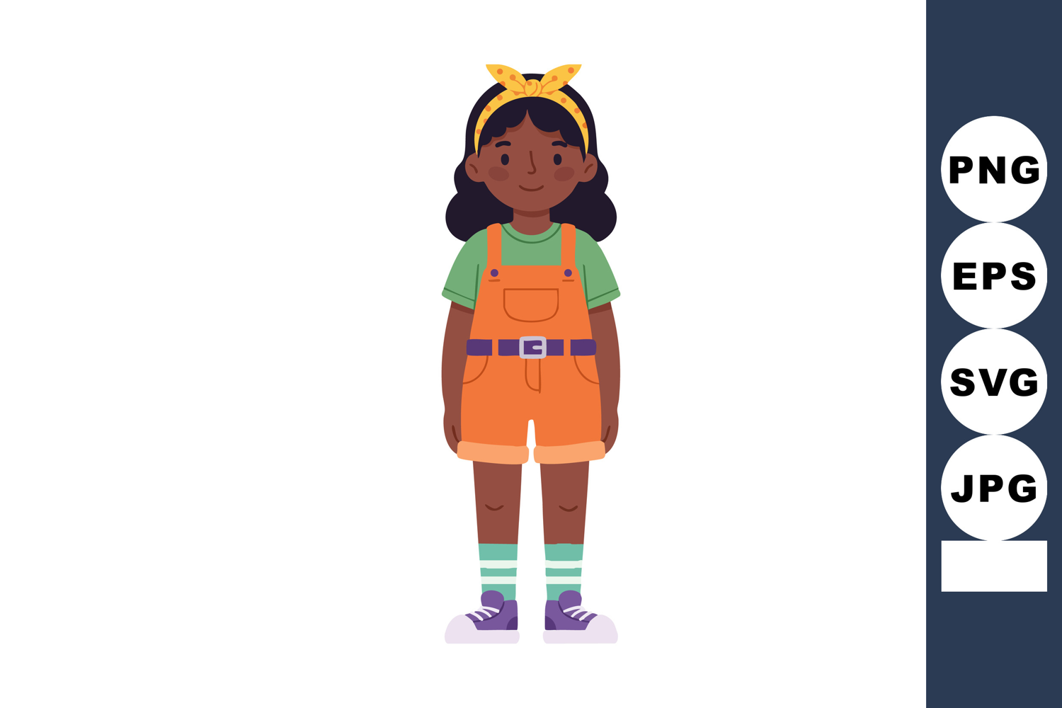This vector illustration shows a smiling girl wearing a yellow headband, orange overalls, green shirt, and purple shoes standing confidently. Cheerful mood.