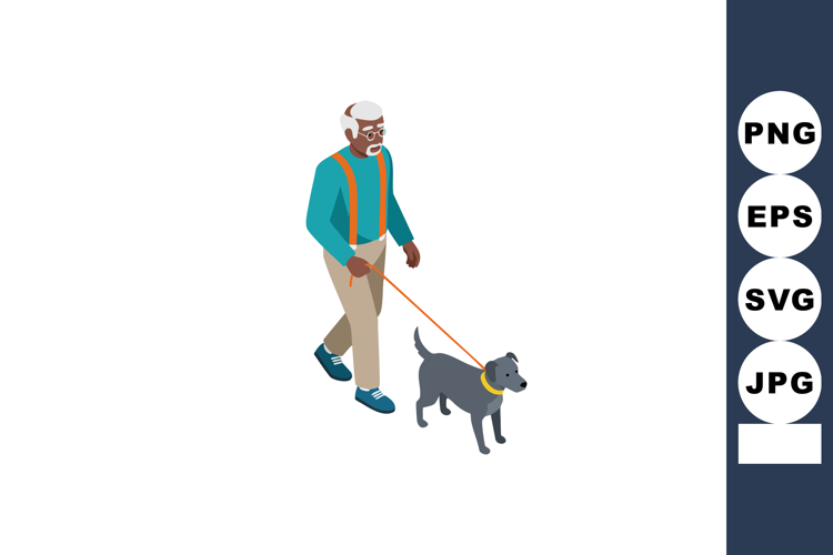 Illustration shows elderly man with white hair walking a small black dog on a leash outdoors in casual clothes, conveying calm and relaxed mood.