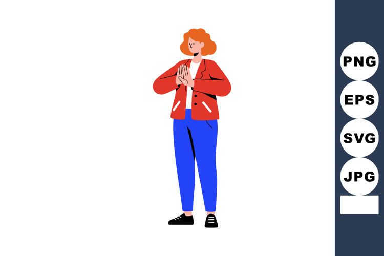 Woman with red hair stands wearing a red jacket and blue pants in a confident pose, simple vector style, bright and modern. Calm mood.