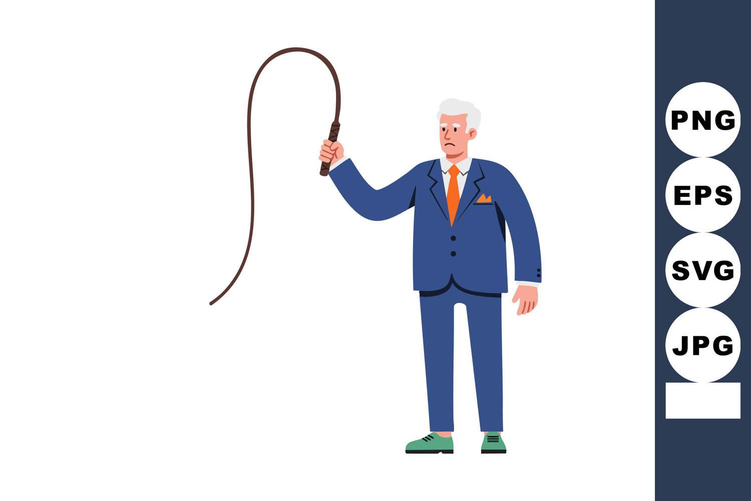 Illustration shows an elderly man in a blue suit holding a whip with a serious expression, wearing an orange tie and green shoes. Serious mood.